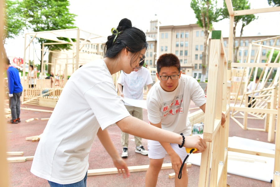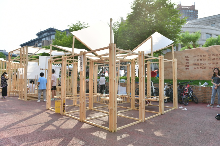 哈工大全媒体(商艳凯/文 张钧瑞 侯力嘉 徐珺婉 葛煜龙/图)在不到一天的时间,分别用100根木条、10张塑料中空板搭建4至6平方米的校园社区交流空间,满足青年的日常休闲与交往活动需求,从而打造属于年轻人的社区“朋友圈”。6月24日,主题为“友·趣”的哈工大第十三届建造节在一校区图书馆前广场举行。副校长沈毅出席并宣布建造节开幕。