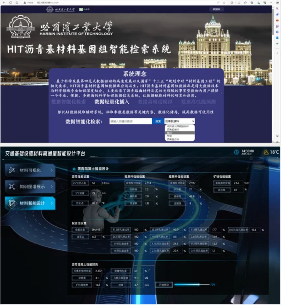 学校深入开展沥青基材料智能化研究,聚焦于人工智能与道路材料前沿交叉,构建了沥青基材料全息基因轻量化数据库和沥青基材料高通量双向智能设计平台。成果应用于绥满公路大庆段改扩建工程等工程中,配合比设计周期降低72%,费用总成本降低56%,路用性能提升10%~15%,获交通运输协会科技进步特等奖、中国公路学会科学技术一等奖。与传统方法相比,人工智能赋能沥青基材料智能设计大幅提升材料研发和评价效率,能耗降低明显。