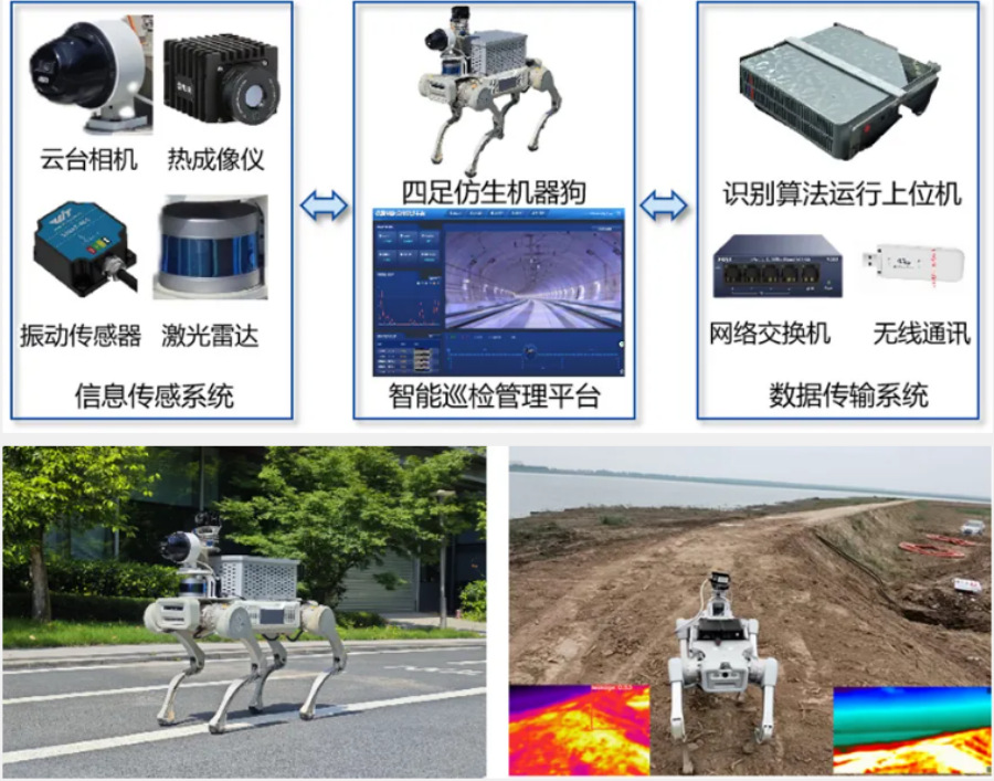 学校围绕地质灾害巡查和地下工程巡检的迫切行业需求,研发智能巡查/巡检四足仿生机器狗系统,实现对岩土与地下工程病害/险情的监测、识别与预警,具有环境自感知、路径自规划、信息自传输和异常自检测等技术能力,先后在应急管理部长江防汛抢险综合演练、湖北省防汛抢险救援综合演练中大显身手。