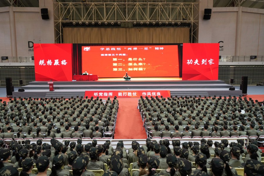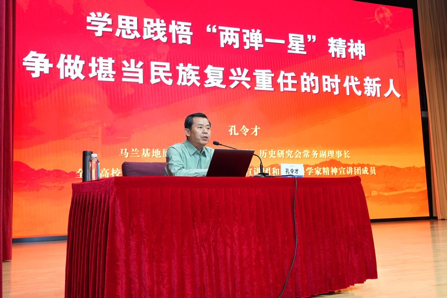 开训仪式结束后,孔令才做客国防大讲堂,以《学思践悟“两弹一星”精神,争做堪当民族复兴重任的时代新人》为题,为一校三区参训学员作报告。他全面系统阐述了“两弹一星”精神的时代背景、丰富内涵和深刻意义,并与同学们分享了生动的历史和人物故事,希望同学们传承弘扬老一辈科技工作者“热爱祖国、无私奉献,自力更生、艰苦奋斗,大力协同、勇于登攀”的崇高精神,为强国建设、民族复兴伟业贡献青春力量。